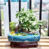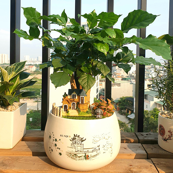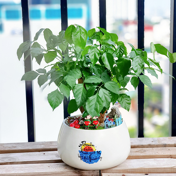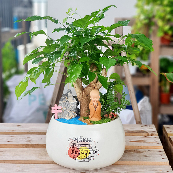Tiểu cảnh Hạnh phúc trồng chậu trụ hoặc chậu dẻ in. Chiều cao cả cây và chậu khoảng 40 – 45cm.